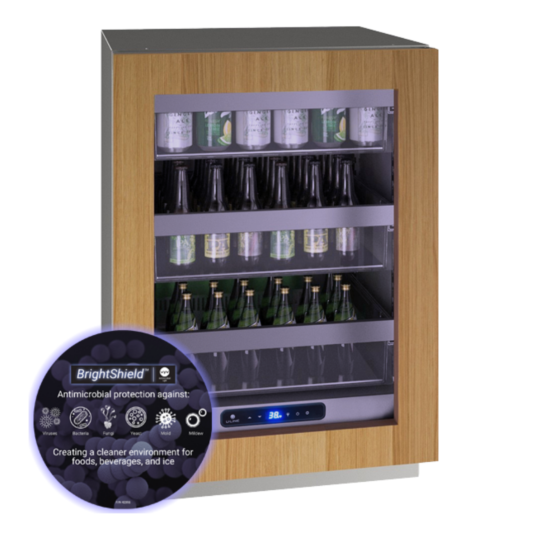 24-inch glass-door refrigerator with integrated frame, reversible hinge, and BrightShield antimicrobial interior coating.